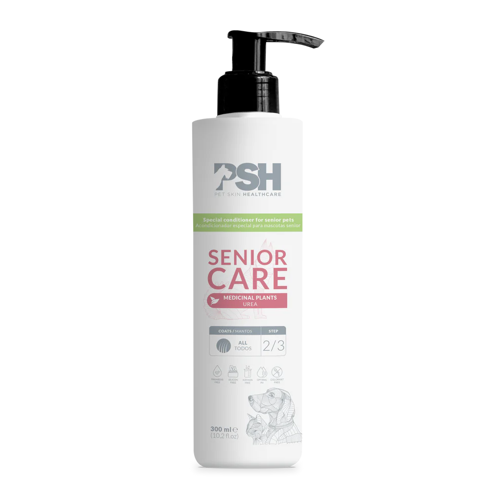 El acondicionador Senior Care está indicado para la higiene del pelaje senior. Formulado con un activo que controla las moléculas de olor características del pelaje senior y las neutraliza, además de extractos naturales de plantas para cuidar la piel sensible y activos seborreguladores para mascotas senior.